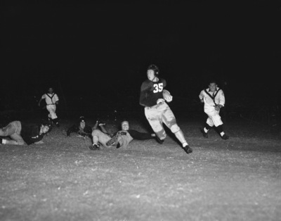 The Texas Christian University Polliwog football team is facing off against Weatherford Junior College Coyotes. Ralph Porter (35) Wog linebacker is showing running with the football. Two Coyotes and Wog are laying in the grass as Porter cuts through the open field. Two referees are in the background, watching the action.