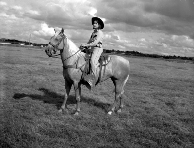 These girls and these horses were at the third annual show of the Texas Palomino Association in Abilene, Texas during the West Texas Fair. Shown here is Mrs. D. L. Harolson of of San Angelo, Texas, on Jolinda. Published in the Fort Worth Star-Telegram morning edition, October 1, 1944.