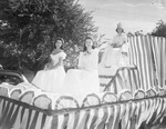 The queen of the Central Texas Fair at Clifton, Texas, seated on the throne on a parade float, is Miss Doris Gene Hoel (right). Her attendants are Miss Lauriece Lyon (left) and Miss Joy Engelking. All three women are wearing dresses. Miss Hoel is also wearing a crown and holding a bouquet of flowers. The float is decorated with streamers of alternating colors.