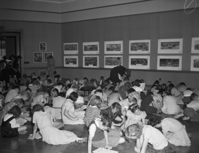 In the Fort Worth Art Association gallery of the Fort Worth Public Library are sixth grade public school students participating in an art quiz program. The program is sponsored by the Fort Worth school system and the Fort Worth Junior League. A large group of students are sitting on a linoleum floor and are completing their quiz. There are instructors around the room to assist the students. Along the walls of the room are arranged a number of art prints. This photograph was published in the October 26, 1941 morning edition of the Star-Telegram.