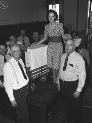 Miss Aileen (Mac) McColister, center, shown with wagon load of gifts and Deputy Sheriffs Lee Porter, left, and Carl Harmon, right. Image appeared in "Mac's Gifts Come by Wagon," Star-Telegram Morning Edition October 2, 1941. When first floor attaches at the Criminal Courts Building Wednesday gave a miscellaneous shower for Miss Aileen (Mac) McColister, center, district attorney's secretary whose marriage will take place October 18, there was ample help to bring in the presents in a little red wagon. The "help," pictured wearing dainty blue ribbons includes, at left, Deputy Sheriff Lee Porter and at right Deputy Sheriff Carl Harmon.