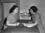 Miss Helen Stephenson, left, getting her poll tax exemption from her sister, Miss Ola Belle Stephenson. Image appeared in "Sisters Register a 'First'," Star-Telegram Evening Edition October 1, 1941. A sister act figured in issuance Wednesday of the first poll tax exemption in Tarrant County as Miss Helen Stephenson, left, who will be 31 in March of 1942, obtained an exemption from Miss Ola Belle Stephenson, deputy clerk in the tax assessor-collector's office. The sisters live at 2809 Runnels Street. First poll tax receipt was issued to Chester Crunk, 2511 Pearl Street. Wiley P. Foster, Swift & Co. special officers, who had obtained the first poll tax receipt for the past five years, this year will receive an exemption.