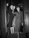 Movie star Ginger Rogers, right, is visiting Fort Worth, Texas with her mother Mrs. Lela Rogers. Miss Rogers, who grew up in Fort Worth, spent the day visiting and taking pictures in her childhood home. In 1940, she won the Academy Award for Best Actress in her performance of "Kitty Foyle". Mrs. Rogers worked as a theater critic for the Fort Worth Record when Ginger was a young girl. The women are climbing aboard a train to return to California. Miss Rogers is wearing a blazer with a pleated skirt. Mrs. Rogers is wearing a hat, blouse, skirt, and is carrying a fur shawl.