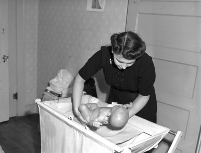 Mrs. S. M. Fitts is demonstrating her daily routine with her 11-week old son William "Bill" Samuel Fitts. One of the chores on her agenda is to put Bill down for a late morning nap. Bill is shown on the changing table after his bath. Once Bill is down for his nap, Mrs. Fitts, the former Miss K. Dee Sloan, will turn her attention to household chores. She standing over the changing table, wearing a dark, button-up dress.