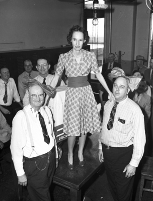 Miss Aileen (Mac) McColister, center, shown with wagon load of gifts and Deputy Sheriffs Lee Porter, left, and Carl Harmon, right. Image appeared in "Mac's Gifts Come by Wagon," Star-Telegram Morning Edition October 2, 1941. When first floor attaches at the Criminal Courts Building Wednesday gave a miscellaneous shower for Miss Aileen (Mac) McColister, center, district attorney's secretary whose marriage will take place October 18, there was ample help to bring in the presents in a little red wagon. The "help," pictured wearing dainty blue ribbons includes, at left, Deputy Sheriff Lee Porter and at right Deputy Sheriff Carl Harmon.