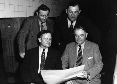 Leaders in a Masonic Temple drive to retire the Temple's debt are (seated) Ward Collier, left, W. Steve Cooke, (standing, left ) Clyde Penry and Clarence Kraft. The men are all wearing suits and ties and are looking at a large sheet of paper. This photograph was published in the October 2, 1941 evening edition of the Star-Telegram.