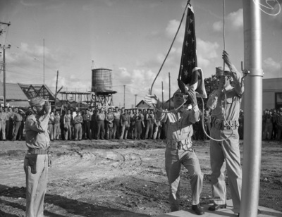 Texasteel Manufacturing Company. Raising the United States Flag over the plant are Privates Arthur L. Cass and Frank Griggs. Another serviceman is saluting the flag.