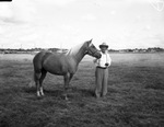 A horse named "Shirley Temple," owned by Charles Copeland and Sons, Blackwell, Texas, which won first place for stock mares at the third annual Texas Palomino Association horse show. Copeland is standing beside the mare, wearing a collared shirt, trousers and a cowboy hat.