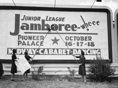 The Junior League Jamboree is being advertised on billboards all over the city. Putting the finishing touches on one of the billboards, left to right are Mrs. Jack G. Gaither Junior, Mrs. Ben M Terrell Junior, and Mrs. J. W. Shugart Junior. The 1941 production of the Junior League will be presented at the Pioneer Palace, October 16 through 18. Mrs. Gaiter is holding a piece of the advertisement. She is dressed in a hat, blouse, and skirt. Mrs. Terrell is smoothing the billboard with a long broom. She is wearing a hat a button-up dress. Mrs. Shugart is also smoothing the billboard with a long broom. She is dressed in a hat, button-up blouse, and a skirt. Published in the Fort Worth Star-Telegram morning edition, October 5, 1941.