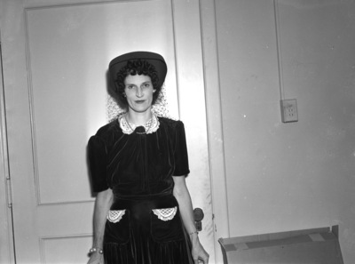 Mrs. John Henry Matthews is pictured here. She is shown standing in a room against a closed door, facing front and looking to the camera. She is wearing a dark color dress and a hat. She is also wearing jewelry -- a pearl necklace, bracelet, earrings and wrist watch. She is the former Miss Ruth Martin Buzzell until her marriage September 17. Published in the Fort Worth Star-Telegram evening edition, October 15, 1941.
