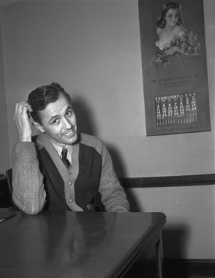Al Brandt is an ambulance driver in Shannon, Texas. He lost his third race with the stork and this time it was twins who were born as he sped toward the hospital. In this picture, Mr. Brandt is sitting at a desk, leaning his head against his hand. He is wearing a dress shirt, necktie, and sweater. There is a calendar hanging on the wall. Published in the Fort Worth Star-Telegram morning edition, February 18, 1940.