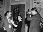 Kiwanis Club. Banquet luncheon at Hotel Texas. J. Willard Ridings, professor of Journalism at Texas Christian University. Pinning a rose on his lapel is Mrs. Una Stewart. The candid camera man is Mort Ellett. Published in the Fort Worth Star-Telegram Morning edition October 3, 1941.