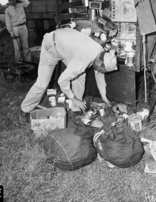 The 45th Infantry Division is returning to Camp Barkeley, in Abilene, Texas, after a successful War Games. After seven weeks of war maneuvers in Louisiana, they helped push Blue Army to win the games. While stopped in Weatherford, Sergeant Shelby Elliott is at the rear of an army chuck wagon, stacking groceries for night mess. Sergeant Elliot is with the Headquarters Company, 120th Quartermaster Regiment.. He is smoking a cigarette, dressed in his military uniform. There is an unidentified man in the background.