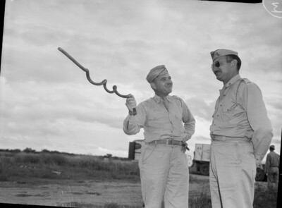 The 45th Infantry Division is returning to Camp Barkeley, in Abilene, Texas, after a successful War Games. After seven weeks of war maneuvers in Louisiana, they helped push Blue Army to win the games. Supervising traffic at the overnight campsite in Weatherford, Texas are left to right Captain Roy B. Flippin and Lieutenant Cecil R. Black. Captain Flippin is wearing his military uniform and pointing with a crooked cane. Lieutenant Black is standing at an at-ease position, dressed in his military uniform.