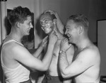 Seventy-two selectees from Camp Grant, Illinois, en route to Camp Wolters, Mineral Wells, Texas, took advantage of the facilities offered at the United Service Organization room at the Bowen Bus Center during a layover in Fort Worth, Texas. Left to right, Chester Piwowar, of Chicago, Illinois, uses a safety razor on the stubble of Gilbert Smalley, of Milwaukee, Wisconsin, while Willard Milligan, of Cairo, Illinois, looks on. Milligan has one hand on Smalley's shoulder and one hand is holding Smalley's head still. Piwowar is wearing a sleeveless shirt and trousers. The other two military men are shirtless.