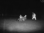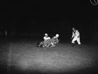 A high school football game between the Polytechnic Parrots and the Arlington Heights Yellow Jackets (white jerseys) is being held at Farrington Field in Fort Worth, Texas. Early in the game Parrot end James Jones (66) caught a pitch from the quarterback. He ran twenty-three yards until two Yellow Jackets wrapped him in a tackle at the thirty-six yard line. The referee is standing close to the action, determining whether Jones' knee is down. Poly went on to win the game 26-6. A scrum of young men in front of a referee. "(Star-Telegram Photos by Tommy Dillard.)" Published Star-Telegram Morn. Oct. 5, 1941.