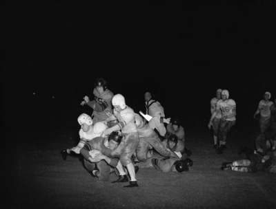 A high school football game between the Polytechnic Parrots and the Arlington Heights Yellow Jackets (white jerseys) is being held at Farrington Field in Fort Worth, Texas. Shooting through the right guard is Howard Reynolds, the shifty back for the Parrots. He is tearing away from several defenders including Wilford Revercomb (standing). Reynolds' run went for the third Poly touchdown of the night. They went on to win the game 26-6. A tangle of about eight young men, with the referee in the background, whistle in mouth. "(Star-Telegram Photos by Tom Dillard.)" Published Star-Telegram Morn. Oct. 4, 1941.