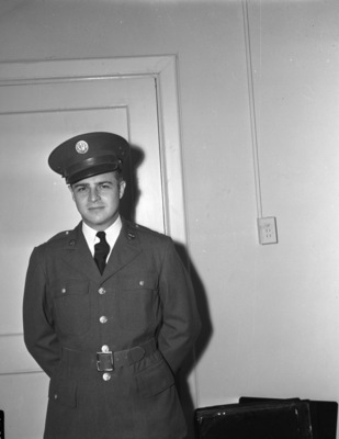 Private Frederick C. Nemitz is a 25-year-old solider with the 328th School Squadron. Private Nemitz is in Fort Worth, Texas, on a two-week furlough to visit family and friends. He is stationed at Gardner Army Airfield in California. Private Nemitz is shown standing in front of a door in an at-ease position. He is dressed in his military uniform.