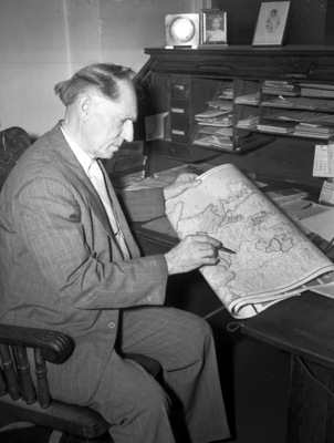 Tarrant County School Superintendent Dr. A. D. Roach, is shown at his desk. He is examining a map similar to the type that will run as a series in the Fort Worth Star-Telegram. The maps, of the National Geographic Society, will be called "Vital Regions of the World." Dr. Roach is dressed in a pinstripe suit. Papers, letters, calendars, and family photographs cover his desk.