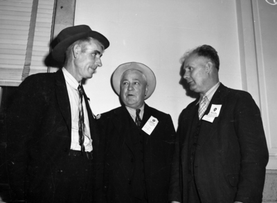 Three attendees at 36th Division Reunion are pictured here. They are from left to right: J. K. Chambliss, Quanah, Texas, L. S. Aiken, Quanah, Texas and J. M. Cook, Turnersville, Texas. All three men are wearing suits, ties and name tags and two of them wearing hats.
