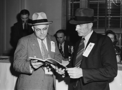 The 36th Division Veterans Association annual reunion held on Saturday at Hotel Texas. Two attendees are pictured here. They are from left to right: H. H. Webb (left), Fort Worth, Texas and Henry Krapf of Purcell, Oklahoma. They are looking over the registration book. Both men are wearing suits, ties and hats and have reunion name tags attached to their jackets. They became wartime buddies in the Headquarters Company of 142nd Infantry. Behind them are other unidentified attendees. Published in the Fort Worth Star-Telegram evening edition, October 4, 1941.