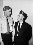 The 36th Division Veterans Association annual reunion held on Saturday at Hotel Texas. Two attendees are pictured here. They are from left to right: Dillard Davis, Fort Worth, of Headquarters Company, 144 Infantry, and John W. Roberts, Knox City, Headquarters Company of the 142nd Infantry. Both veterans are wearing hats and Dillard has reunion name tags attached to his shirt pocket. John is wearing a pair of glasses. Published in the Fort Worth Star-Telegram evening edition, October 4, 1941.