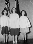 36th Division Veterans Association annual reunion was held at Hotel Texas, Fort Worth, Texas. Three vested choir members are pictured here. From left to right, are Clementine Murray, Annette Wood and Doris Cohn. The three young girls, pupils of South Hi-Mount School, wearing uniforms (Doris has a different skirt) are standing in a row and singing for the Women's Auxiliary candlelight memorial service. Behind them is a United States and a Texas flag. Published in the Fort Worth Star-Telegram morning edition, October 5, 1941.