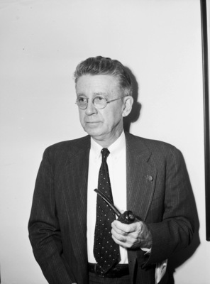 Mr. G. F. Harley, regional director, Defense Public Works, Federal Works Agency is shown standing against a bare wall. He is wearing a suit and tie, eyeglasses and holding a smoke pipe. He talked to Fort Worth Business and Professional Women's Club at a defense luncheon Tuesday at the Hotel Texas. His subject was "Our Defense Program." Published in the Fort Worth Star-Telegram evening edition October 7, 1941.