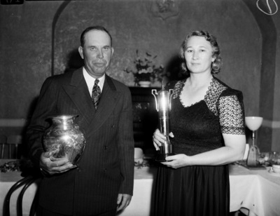 Highland Hereford Association staged the Eleventh Annual Feeder Sale at Marfa, Texas. The cattlemen from many States attended the sale to bid on the fine cattle or to look them over while meeting friends. Two attendees are pictured here. Mr. and Mrs. Kenneth Smith of Marfa, Texas. They are standing in front of a dinning table. Mr. Smith is wearing a suit and tie. Mrs. Smith is wearing a dress. Both are holding trophies won by their cattle. Published in the Fort Worth Star-Telegram morning edition, October 7, 1941.