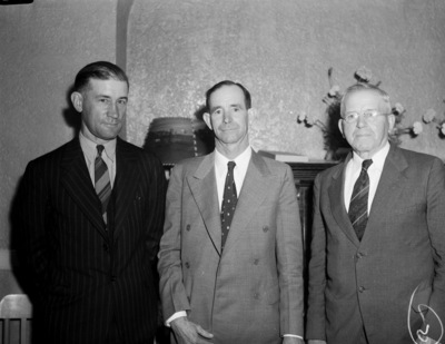 Highland Hereford Association staged the Eleventh Annual Feeder Sale at Marfa, Texas. The cattlemen from many States attended the sale to bid on the fine cattle or to look them over while meeting friends. Men who judged the feeder cattle offered in the sale this year are pictured here. They are, from left to right, Frank Norrish of Morrison, Illinois; Dave Webel of Pitsfield, Ilinois, and Fred Steiner of Kenton, Ohio. Three men are shown standing in a room, wearing suits and ties. All three are thoroughly familiar with feeder cattle bred in Texas as they have fed such cattle during many years past. Published in the Fort Worth Star-Telegram morning edition, October 7, 1941.