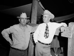 Some attendees who took part in the recent sale of feeder cattle by the Highland Hereford Breeders Association at Marfa, two of them are pictured here. They are W. B. Mitchell (left), Marfa, Texas and Joe B. Matthews of Albany, Texas. Both men are standing outside, wearing trousers, shirts, hats and eyeglasses. They are talking over cattle conditions in West Texas. Published in the Fort Worth Star-Telegram morning edition, October 8, 1941.