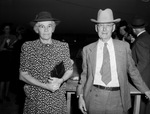 Some attendees who took part in the recent sale of feeder cattle by the Highland Hereford Breeders Association at Marfa, two of them are pictured here. They are Mr. and Mrs. T. C. Mitchell, Marfa, Texas. Mr. Mitchell is wearing a suit, tie, hat and eyeglasses. Mrs. Mitchell is wearing a pattered dress, hat and holding a handbag. They are the ranchers of the Marfa section, who take great interest in the annual sales. Published in the Fort Worth Star-Telegram morning edition, October 8, 1941.