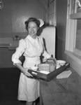 The nurses at Camp Wolters in Mineral Wells, Texas, are staying busy with their rounds. The average daily census of patients at the hospital is around 500. One of the nurses on duty is Juanita Armstrong. She is from Lawton Oklahoma and trained at West Oklahoma Charity Hospital. She is dressed in her nurses uniform, carrying a tray of food one of her patients. Published in Fort Worth Star-Telegram, morning edition, October 7, 1941.