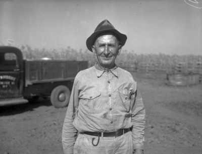 W. S. Woodruff, of Rochester, Illinois, is a cattle feeder from the Corn Belt who will attend a cattle auction in Marfa, Texas. In 1940, he purchased some of the George Jones cattle for feeding. He is standing outdoors, in front of a truck. Also in the background are rows of crops. Woodruff is wearing a long-sleeve, button-down shirt, trousers, a belt and a hat.