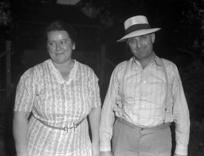 Mr. and Mrs. Meade McWilliams, of Pawnee, Illinois, are among the cattle feeders from the Corn Belt states who will attend a feeder cattle auction at Marfa, Texas. For several years McWilliams has purchased from 1,000 to 1,500 Texas-bred cattle, most of them in the Highland Hereford area around Marfa, Texas, for shipment to Illinois. Mrs. McWilliams is wearing a floral print dress with a lace collar and a belt at the waist. Mr. McWilliams is wearing a hat, striped, button-down shirt, trousers and suspenders.