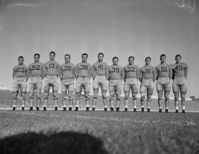 The Texas Christian University football team is hosting the University of Tulsa at Amon G. Carter Stadium to open the season. The visiting Hurricanes, standing shoulder to shoulder left to right, are Jim Vickers (62) back, L. D. Moore (52) end, Kenneth Gibson (13) end, Jim Worthington (26) tackle, Glenn Henicle (38) guard, Ralph Morgan (41) center, Wayne Holt (39) guard, C. H. Greene (22) tackle, Alston Campbell (16) end, Joe Gibson (51) back, and Glenn Dobbs (45) back. Head coach Henry Frnka has built a strong defensive squad and believes they will have an edge over the Frogs. The Hurricanes ended up losing the game 6-0 after gaining only two first downs. Published in the Fort Worth Star-Telegram morning edition, September 27, 1941.