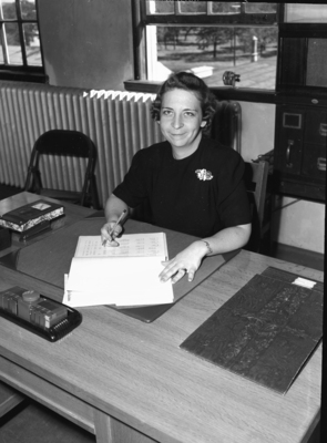 Miss Billy Williamson of Arlington, Texas who is serving her first week as district supervisor of the homecoming for the State Board for Vocational Education. The office was moved last week from Fort Worth to North Texas Agricultural College in Arlington. She is sitting by her desk and posing for a picture. Published in the Fort Worth Star-Telegram morning edition, September 27, 1941.