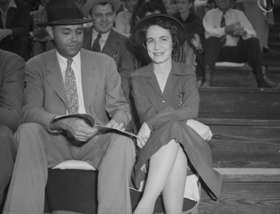 The Baylor Bears are opening their college football season at Municipal Stadium in Waco, Texas. They are hosting the visiting Hardin-Simmons Cowboys. Attending the game, left to right, are J. L. Bass and Miss Mildred Caldwell. Mr. Bass, is visiting from Washington D. C. He is dressed in a fedora hat, a light-colored button down shirt, a paisley tie, and a single-breasted suit. Miss Caldwell is a resident of Abilene, Texas, and is in Waco to cheer on the Cowboys. She is wearing a felt hat and a solid-color dress with a button front bodice over a pleated skirt. She has an elaborate pin with a watch pinned to the pocket on her bodice, and is wearing a slip and silk stockings. The pair are sitting on a blanket and pillows. Behind them is a man in a tweed-looking suit with a striped light-color shirt and a diagonal tie, with a hat and pens in his jacket pocket. On the aisle behind and beside Ms. Caldwell is a man in a light shirt, dark pants, and a pair of western boots. Baylor went on to win the game 24-0. Published Star-Telegram Morn. Sep. 29, 1941.