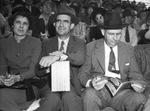 The Baylor Bears are opening their college football season at Municipal Stadium in Waco, Texas. They are hosting the visiting Hardin-Simmons Cowboys. Attending the game, left to right, are Mrs. Jake Sandefer, Mr. Jake Sandefer, and Dr. W. R. White. Mrs. Sandefer is wearing a small box hat, a dress with a buttoning bodice (large decorative buttons), a belt, and matching skirt. She has a dark suit jacket and a handbag on her lap, and is holding a pair of eyeglasses. Mr. Sandefer, Breckenridge, Texas, is the chairman of the H. S. U. board of directors. He is dressed in a fedora hat, a light colored suit and a square-patterned tie with a dark suit. He has a cloth-covered box on his lap and a wrist watch strap is in few under his sleeve. Dr. White is the president of Hardin-Simmons. He is wearing a fedora hat, a light shirt, a checked tie with a tie chain and fob, a patterned gray single-breasted suit, and wire-rimmed glasses. He is reading a program that has a Camel cigarette advertisement on the back page. Baylor went on to win the game 24-0. Published Star-Telegram Morn. Sep. 28, 1941.