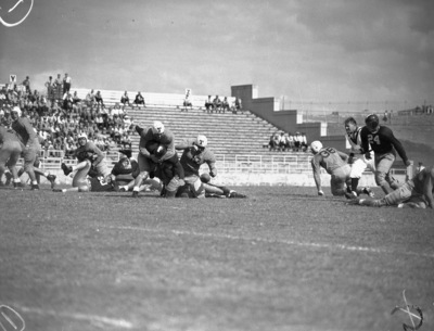 The Texas Christian University Horned Frogs are hosting the visiting University of Tulsa Golden Hurricanes. The match-up marks the opening game of the 1941 football season at Amon G. Carter Stadium in Fort Worth, Texas. Golden Hurricane, Joe Gibson (not shown) fumbled the football, resulting in a scramble. Frog Mike Harter is shown lunging for the ball surrounded by Hurricanes. An unidentified player is on his back and Sax Judd (12) is also in on the scrum. Other Frogs pictured are Nolan Sparks (24) and Billy Blackstone (50). The Frogs went on to win the game 6-0. Published in Fort Worth Star-Telegram, morning edition, September 29, 1941.