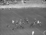 The Texas Christian University Horned Frogs are hosting the visiting University of Tulsa Golden Hurricanes. The match-up marks the opening game of the 1941 football season at Amon G. Carter Stadium in Fort Worth, Texas. The Frogs were in the midst of a nice drive in the third quarter when John Bond (34) fumbled after a five-yard gain. Tulsa's Ralph Morgan recovered the football on the Hurricane twenty-two yard-line. Other Frogs in on the play are Billy Blackstone (50), Bruce Alford (83), Phil Roach (80), Leonard Pugh (60), and Nolan Sparks (24). Published in Fort Worth Star-Telegram, morning edition, September 28, 1941.