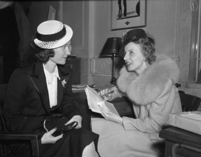 Delta Airlines employees left to right are LaJuan Gilmore, and Miss Laura Wizark. Miss Wizark is the chief stewardess. She spent the day in Fort Worth, Texas interviewing applicants for hostess jobs. She is wearing a hat and a coat with a fur shawl. Miss Gilmore is shown in the interview. She was tentatively chosen as an airline hostess. She is a nurse at Harris Memorial Methodist Hospital. Miss Gilmore is dressed in a hat, button-up blouse, skirt, coat, and a brooch. Published in the Fort Worth Star-Telegram morning edition, February 20, 1940.