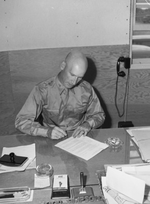 Brigadier General William Hood Simpson is the commander of Camp Wolters Infantry Replacement Center at Mineral Wells, Texas. He is being nominated by President Franklin D. Roosevelt for promotion to Major General. General Simpson is sitting at his desk signing a document. He is dressed in his military uniform. Published in Fort Worth Star-Telegram, morning edition, September 30, 1941.