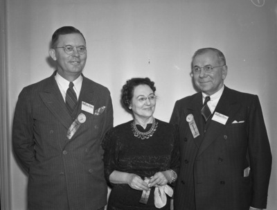 Attending the Texas Milk Dealers and Texas Ice Cream Manufacturers Association convention at the Hotel Texas are left to right J. W. Ridgway, Mrs. H. T. Pangburn, and James C. Nelson. They are all wearing a ribbon with the phrase "San Antonio Next". Mr. Ridgway, of San Antonio, Texas, is dressed in a double breasted pinstripe suit with a pocket square. Mrs. Pangburn, of Fort Worth, Texas is wearing a velvet dress and a necklace. Mr. Nelson, is from St. Louis, Missouri. He is dressed in a double breasted striped suit. Published in the Fort Worth Star-Telegram morning edition, February 20, 1940.