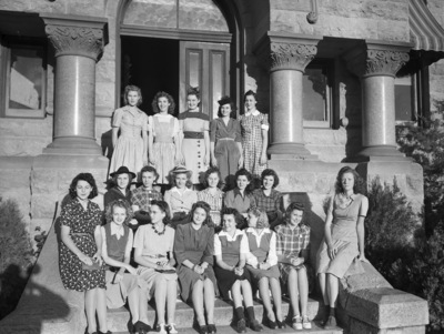 County fair at Denton, Texas. Farmers' Daughters. Front row, left to right, Neoma Hollowwa, Melba Jean Burney, Geraldine Haney of Ponder; Vernelle Rose of Little Elm; Mary Keen, Louise Bradford of Argyle; and Jackie Herd. Second row, La Yuna Shiflett, Juanita Grimes, Margaret Walker, Jean Gotcher, Betty Jo Chumbley and Betty Mulkey. Back row, Georgia Smith, Doris Nell Erwin of Argyle, Charlie Fay Morris, Edwin Mason and Dorothy Jo Turner.
