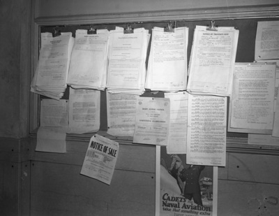 Notice-cluttered bulletin boards at the entrance of court houses in Texas, like this one at the Tarrant County Courthouse, will become obsolete as the result of a new law that requires that legal notices be published in newspapers. One of the signs on the board is a poster for Naval Aviation recruitment.