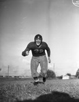 Elmer Addington is a college football player for the Texas Wesleyan Rams. The North Side High School product is preparing for an upcoming home game against Southwestern University, where he will play a leading role. Addington will get the call at left tackle, starting in his first college football game. He is shown at practice, dressed in a number 32 football uniform and a helmet. Published Star-Telegram Eve. Oct. 3, 1941.