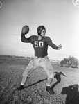 Johnny Hunter is a college football player for the Texas Wesleyan Rams. He is preparing for an upcoming game against the Southwestern Pirates. Hunter is a passing back for the Rams, and if the turf isn't too slippery he will throw often. Over the last two seasons, Hunter has led the Rams in passing. He is shown throwing the ball downfield in practice. He is dressed in a number 50 football uniform and a helmet. Published Star-Telegram Morn. Oct. 4, 1941.