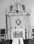 Cantor Samuel Silverman of Chicago, Illinois shown standing before a portion of the Ark of the Covenant at Ahavath Sholom synagogue as he prepares for the Kol Nidre ritual, principal feature of the Yom Kippur atonement services to be conducted at Ahavath Sholom and Beth-El. Published in the Fort Worth Star-Telegram evening edition September 30, 1941.