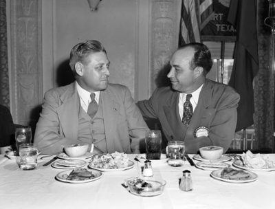 Image shows O. E. Pierson, president of Clifton Lions Club, left, and Charles F. Williams of Fort Worth, Texas, discussing plans over the luncheon table for a "Fort Worth Day" at the Central Texas Fair at Clifton, Texas, scheduled on October 23-26. Officials from Clifton, Texas, were guests at the Fort Worth Lions Clubs luncheon at Hotel Texas. Both men are wearing suits. Published in the Fort Worth Star-Telegram morning edition October 1, 1941.